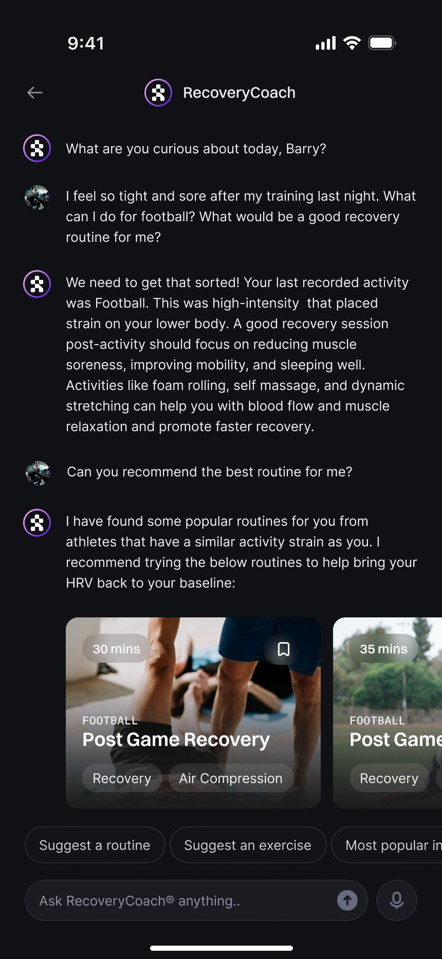 RecoveryCoach takes you through recovery with dynamic feedback