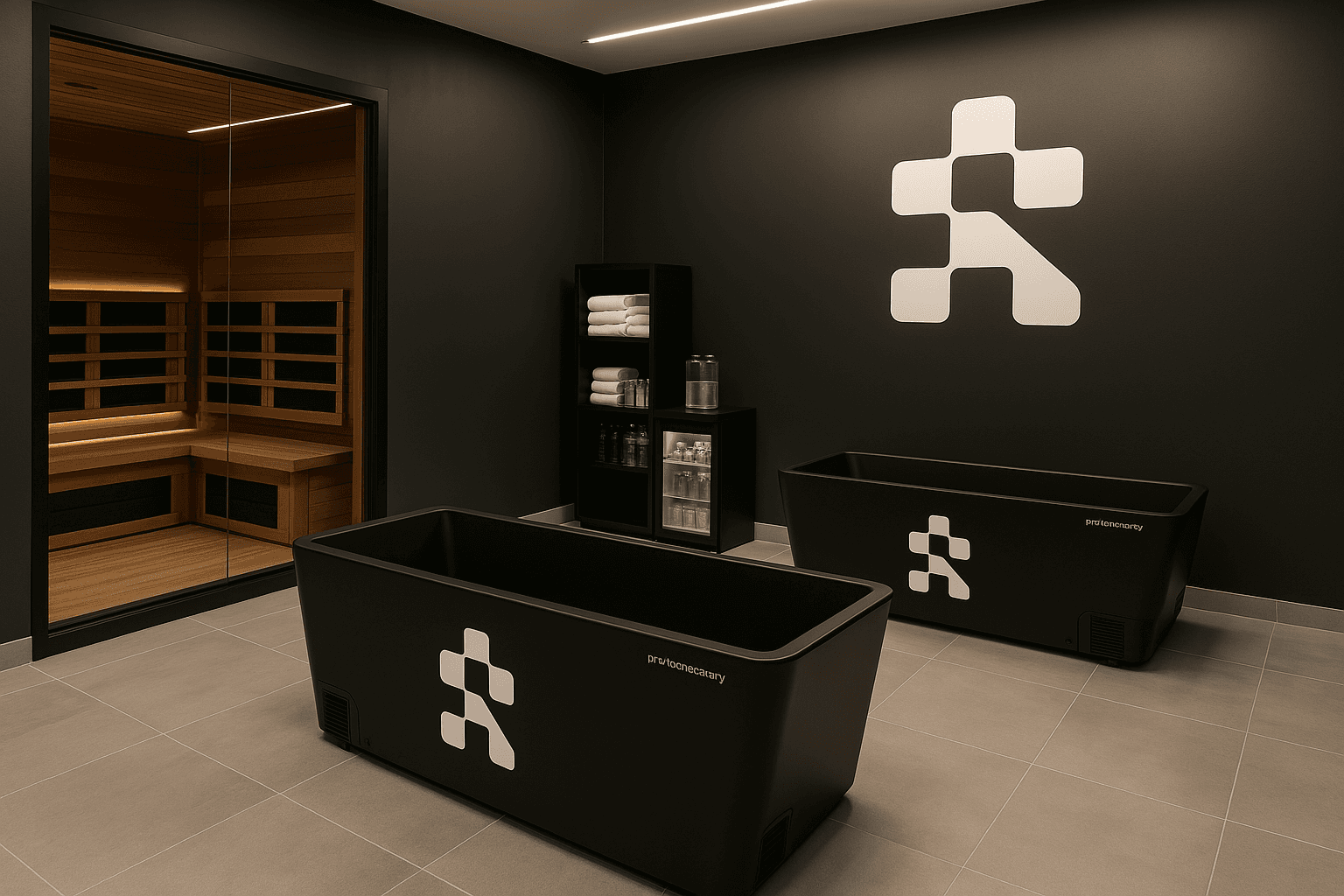 The Ultimate Recovery Space for your club, featuring our 2x next-generation cold plunges, 1x Canadian Hemlock Infrared Sauna, and 8x PROTEC Recovery packages